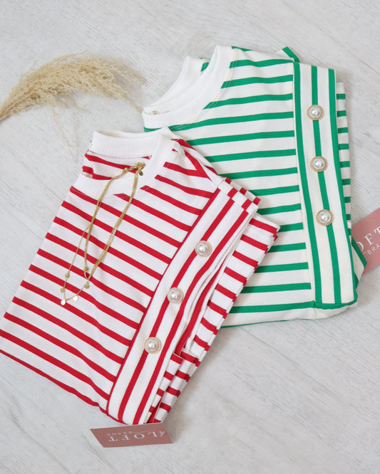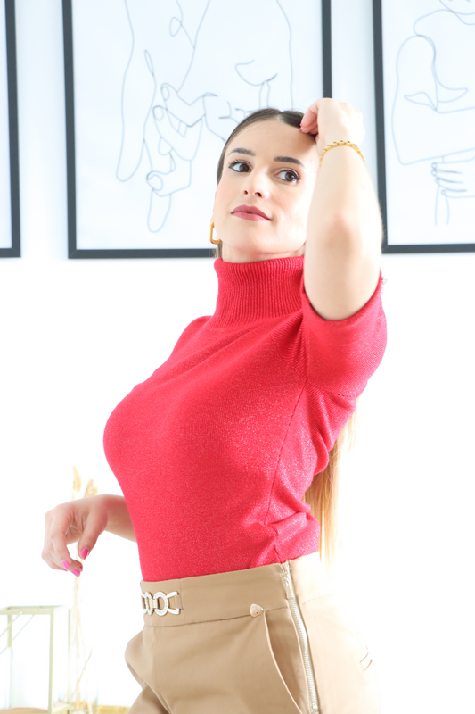 T-shirt de gola alta, manga curta e botões brilhantes nas mangas