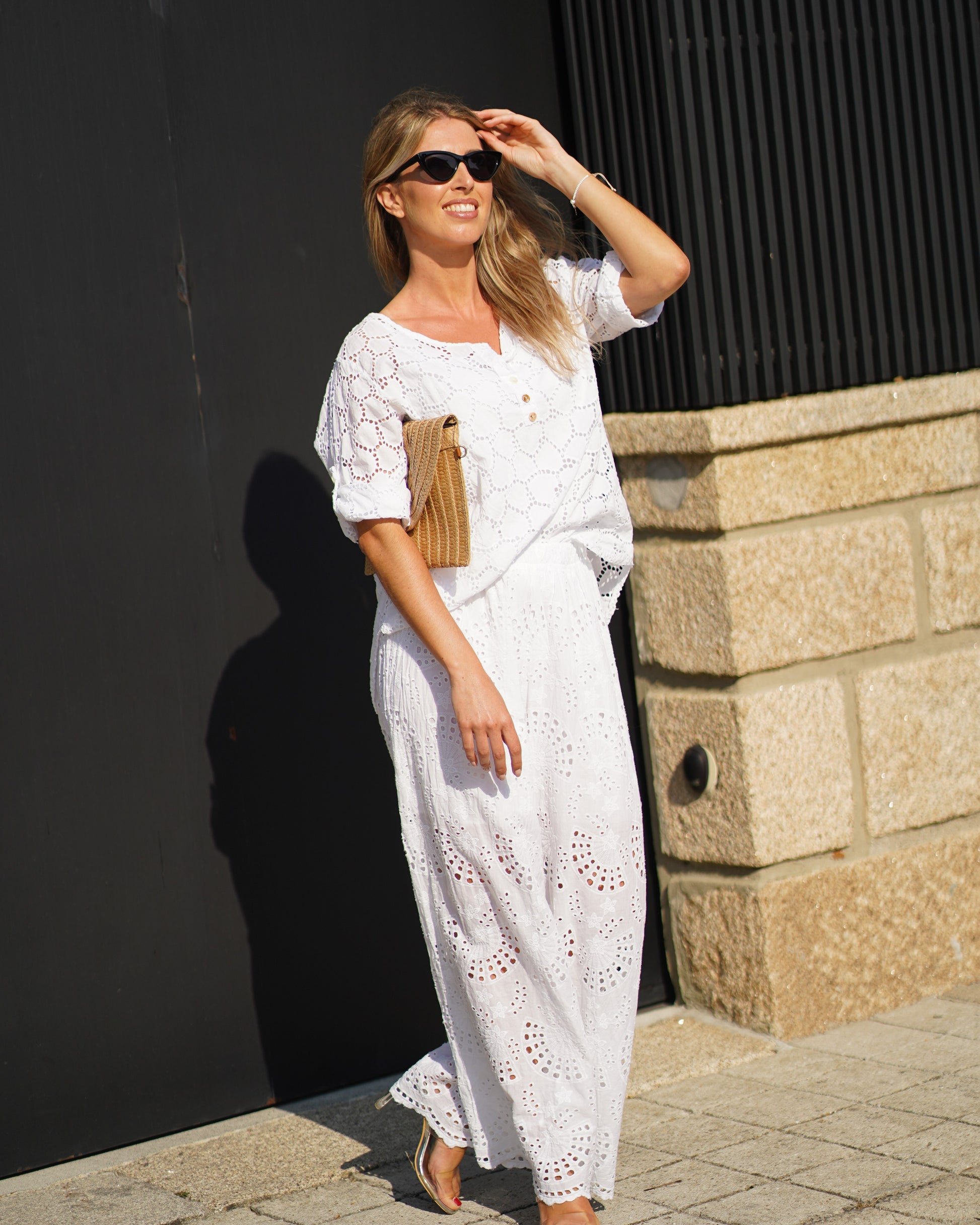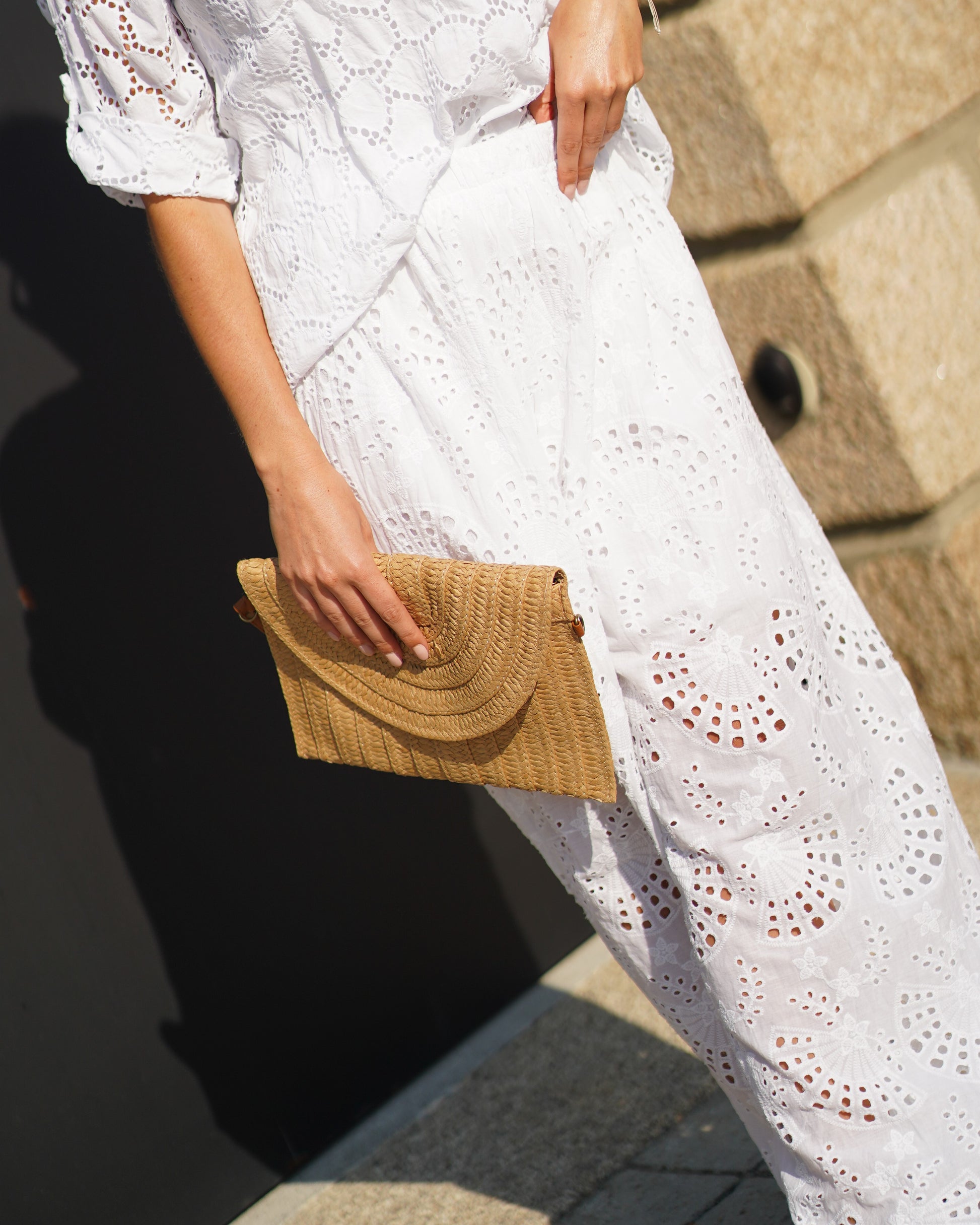 Pantalona bordada com forro. A calça tem cintura elástica e bolsos laterais.
