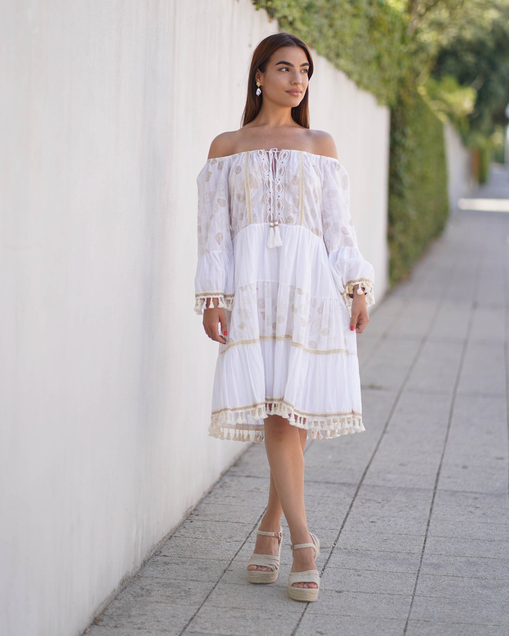 Vestido boho curto em algodão. Apontamentos bordados em dourado e adereços nas mangas e bainha.